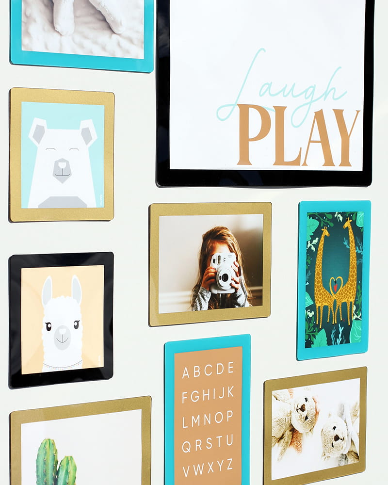 4x4 in frames with prints for children. Colors: Gold, Turquoise, Candy Pink and Silver.